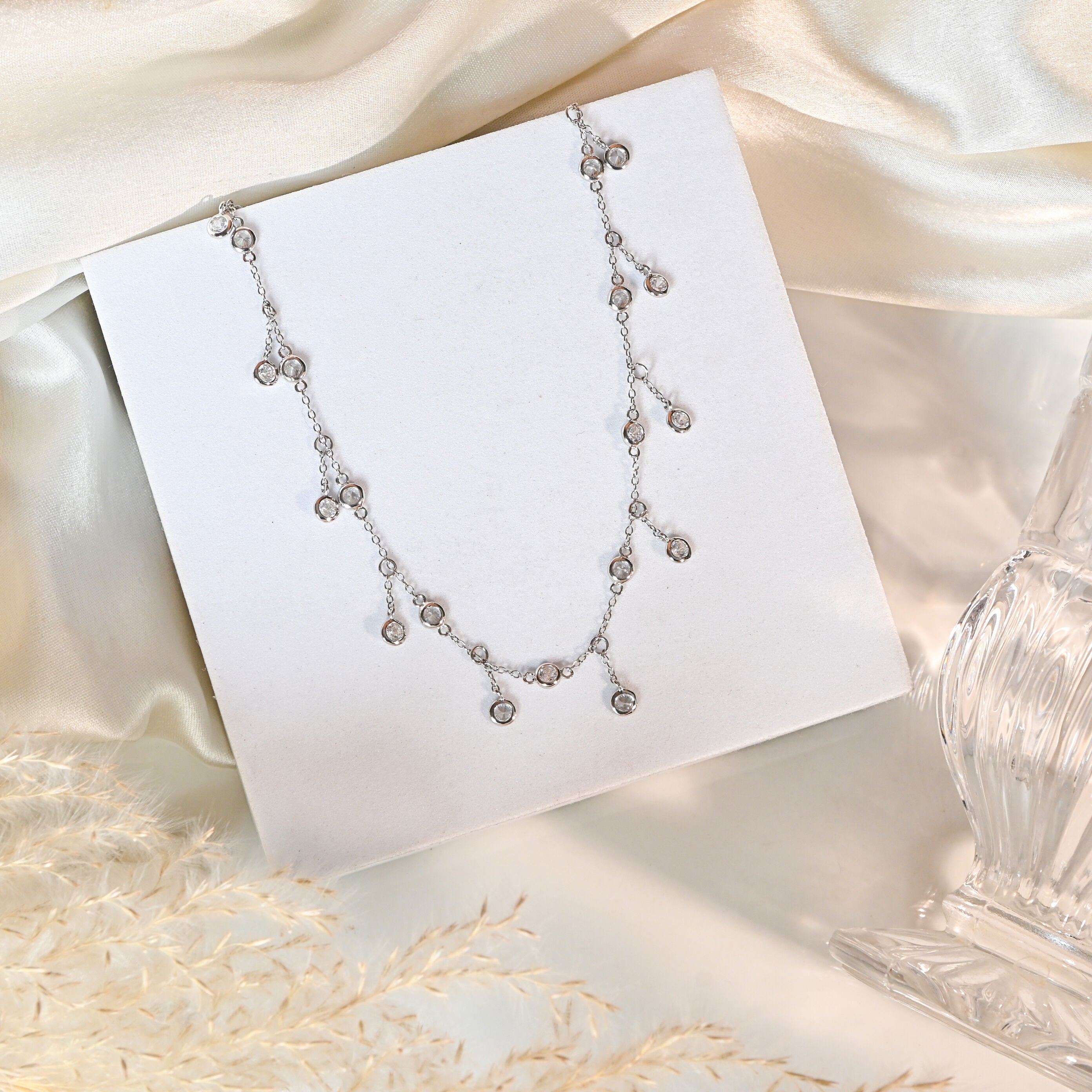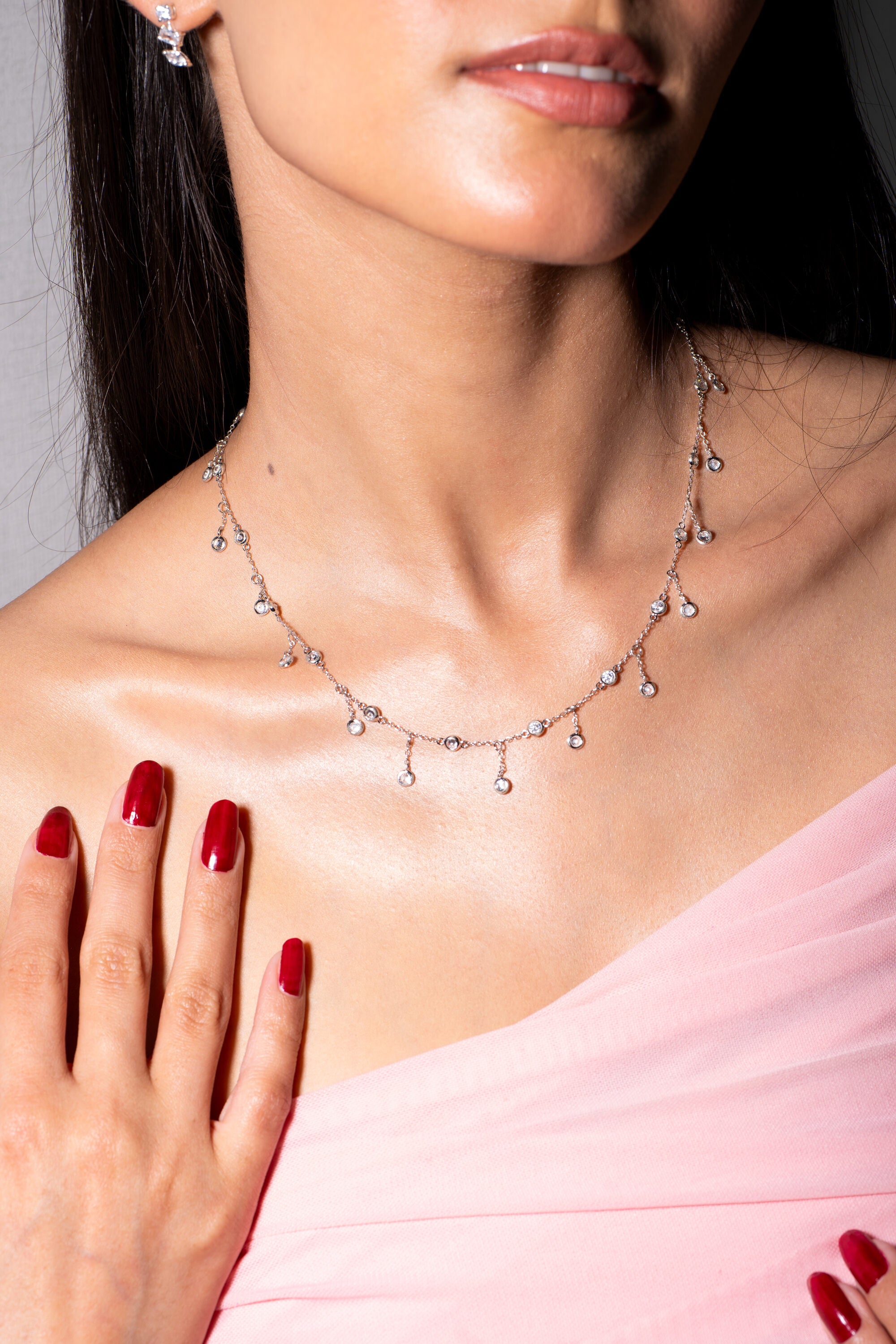 Delicate dangling bezel-set stones create a graceful and sparkling necklace, perfect for layering or wearing solo.