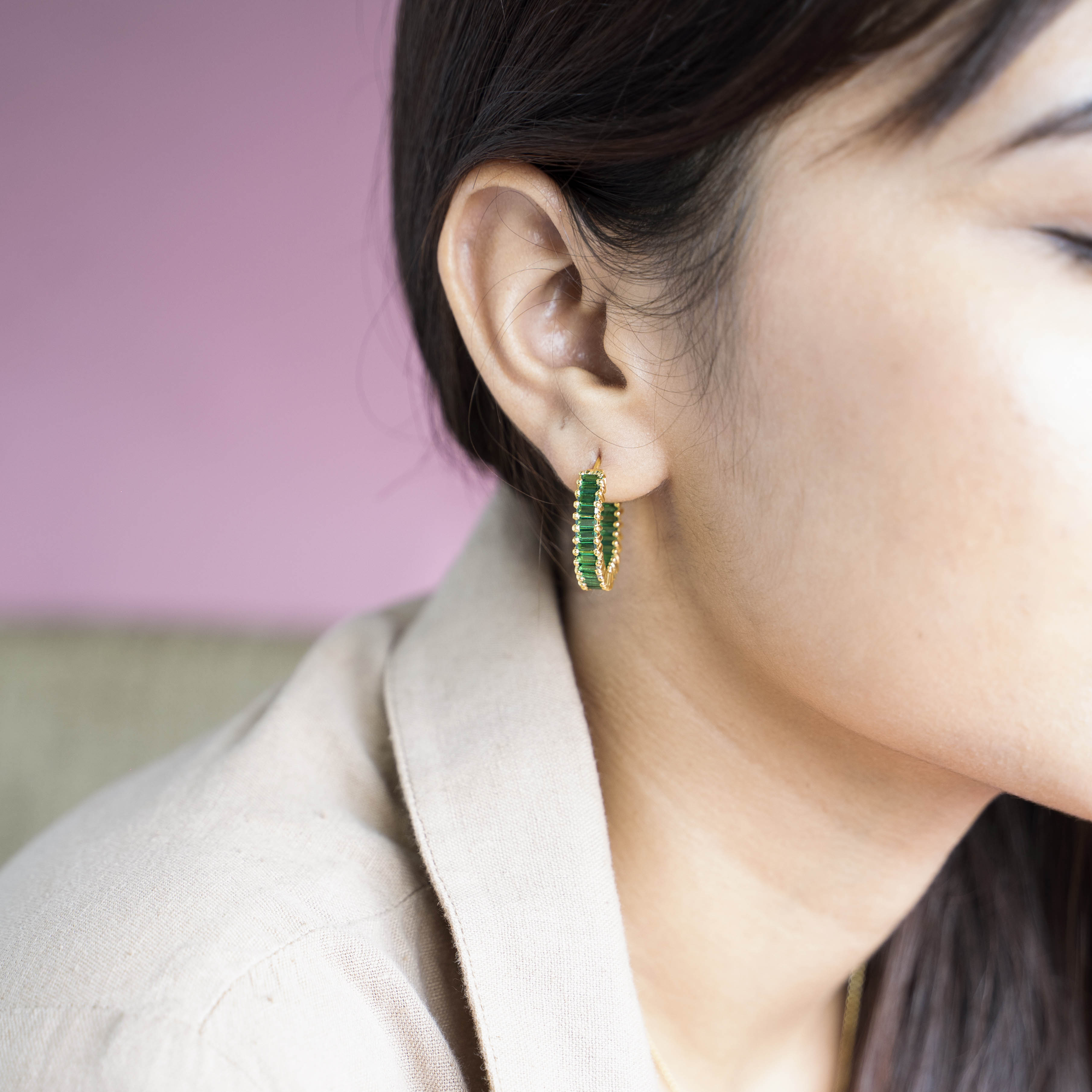 Elevate your style with our Emerald Baguette Hoop Earrings, a perfect blend of class and trendy elegance. These earrings add a vibrant pop of color and sophistication to your look. Embrace the timeless allure of emerald and make a statement with these exquisite accessories that seamlessly blend the classic with the contemporary.