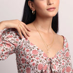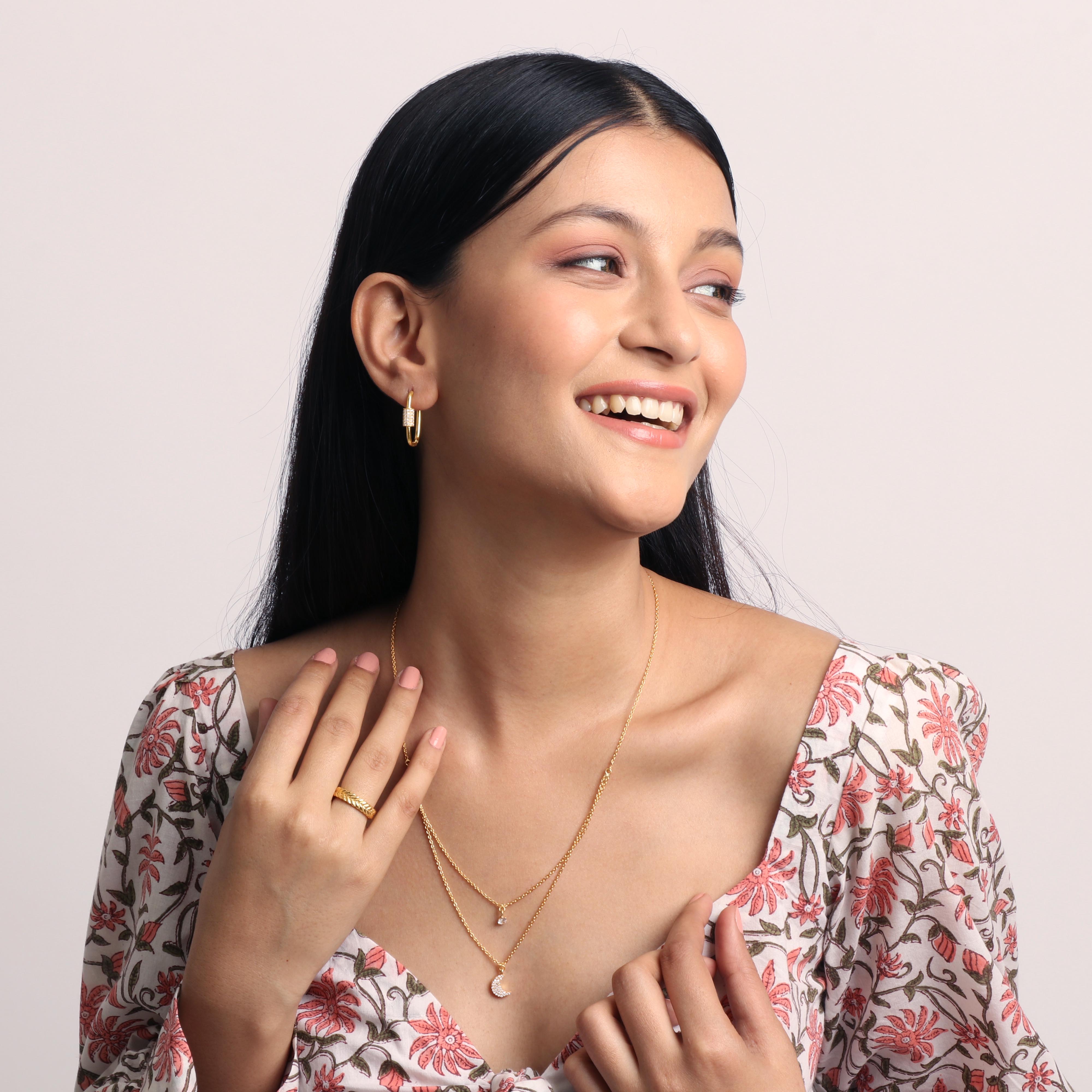 The moon is a feminine symbol, universally representing the rhythm of time. This Double layered gold necklace features a diamond stud and a Crescent Moon Charm. Elegant one, this is one is ideal to amp up your daily office look!