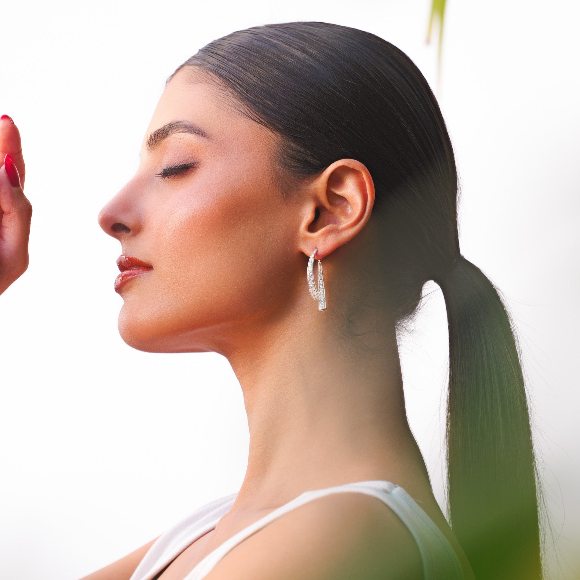 These elegant silver earrings feature intertwined curves encrusted with sparkling stones, creating a graceful and refined look. Ideal for adding a touch of sophistication to any outfit.