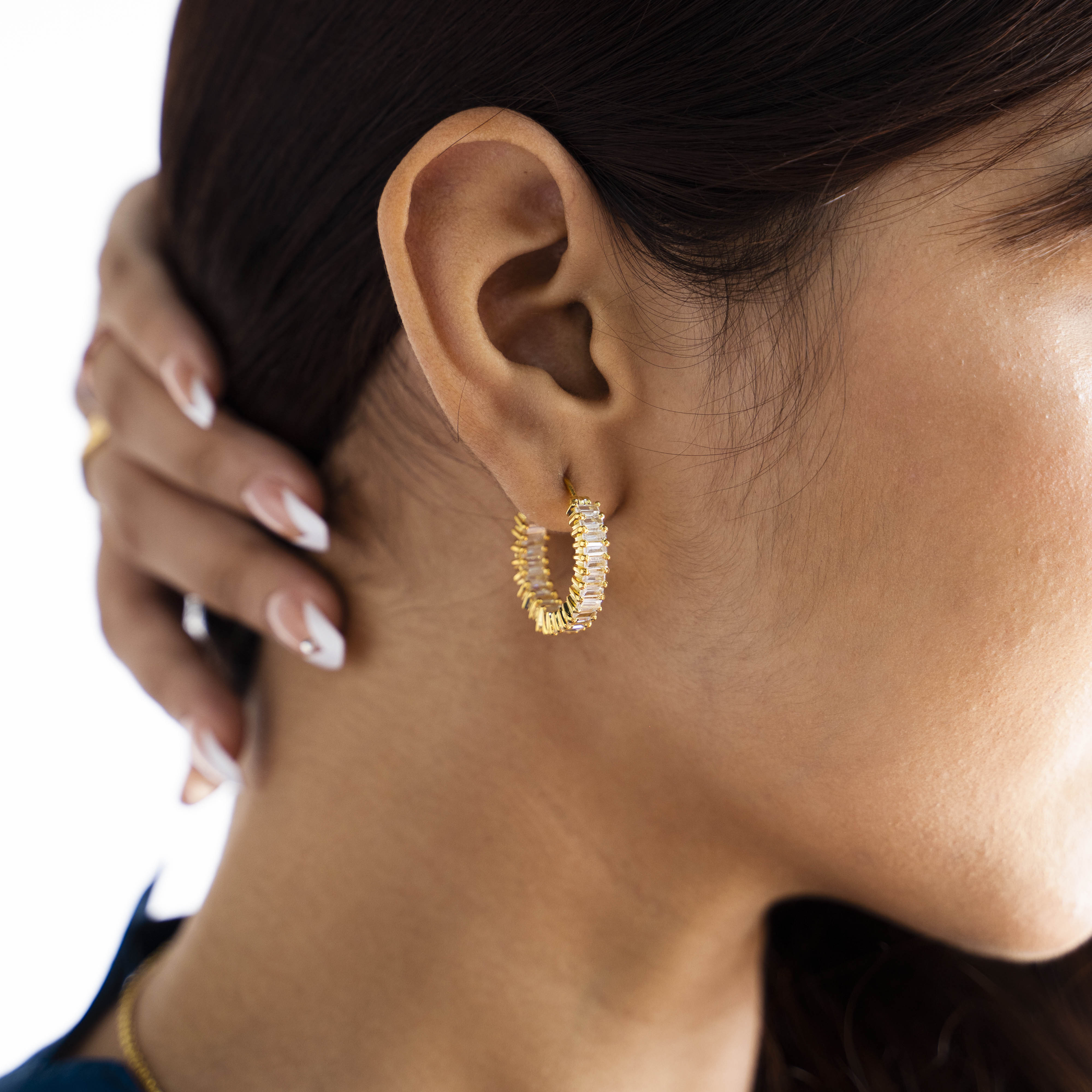 Elevate your everyday style with our stunning white baguette hoops. These versatile earrings are perfect for making a style statement on any occasion. Crafted with precision and elegance, they add a touch of glamour to your daily ensemble.